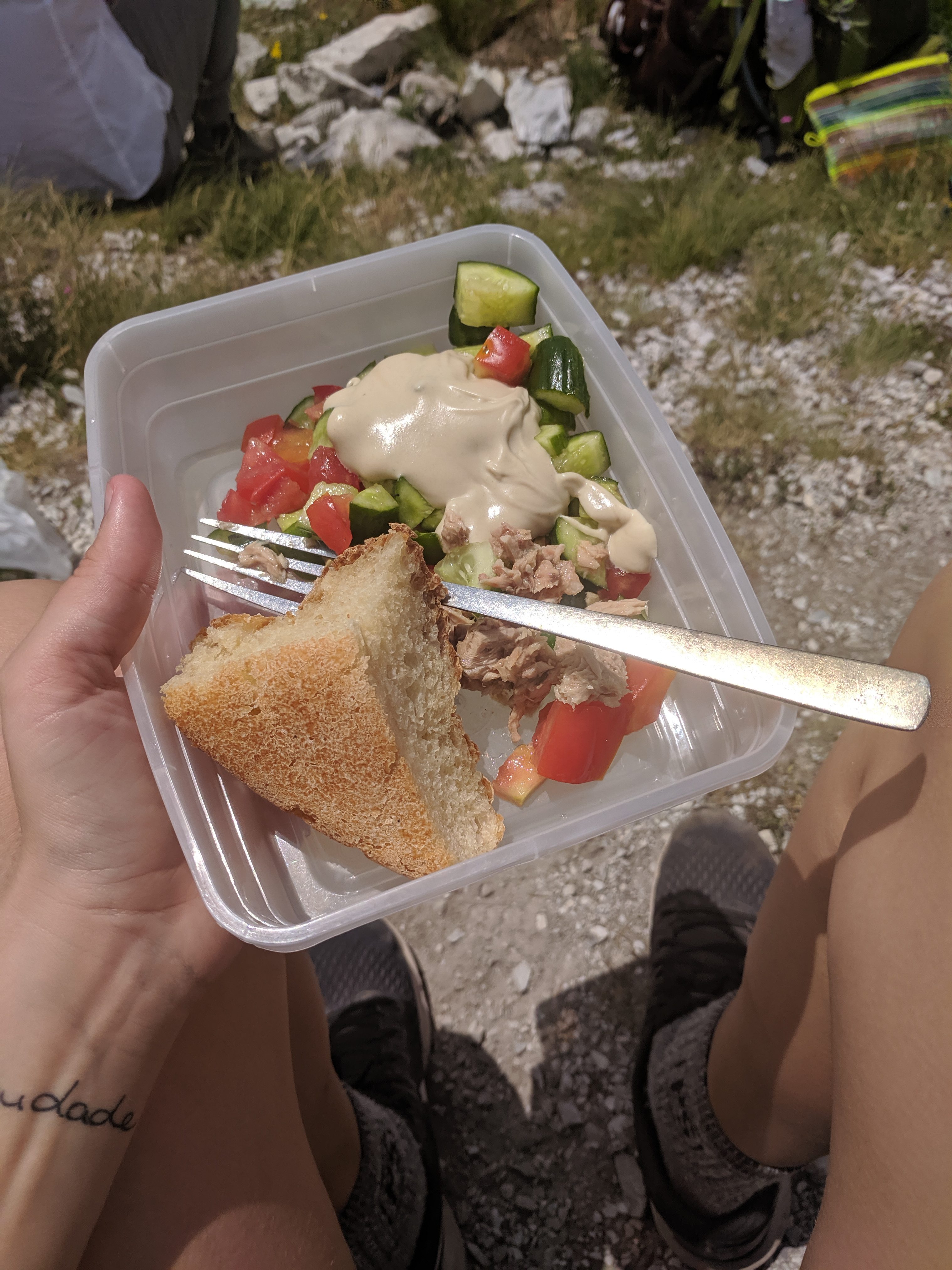 My first official day in the mountains started with the shuttle ride to Theth. The ride was beautiful, with picturesque villages and snow-capped mountains at every turn. We arrived to Theth around 10 am, and after dropping my bags at a guesthouse, I started out on my hike to a waterfall. Minute five into the hike – I fall. Like an idiot, I am climbing down a mountain while peeling an orange. Invincible she is not! I sit, finish my orange, assess the damage, and pour some water to clear the blood. Some germans pass and give me two band-aids. On with the hike! On my way back from the waterfall, the band-aids are completely soaked through with blood. Lord. I stop to decide if I want to leave the band-aids or take them off. A huge group of Israelis find me pondering this question on a rock. Soon I have 20 un-official doctors, along with their tour guide from Kosovo who tried to give me his whole first aid kit. I chuckled and shooed them on their way after grabbing a few spare bandages. I spent the night reading and relaxing at the guesthouse, who kept me thoroughly stuffed with fresh dairy and meat from their farm. The food was great.